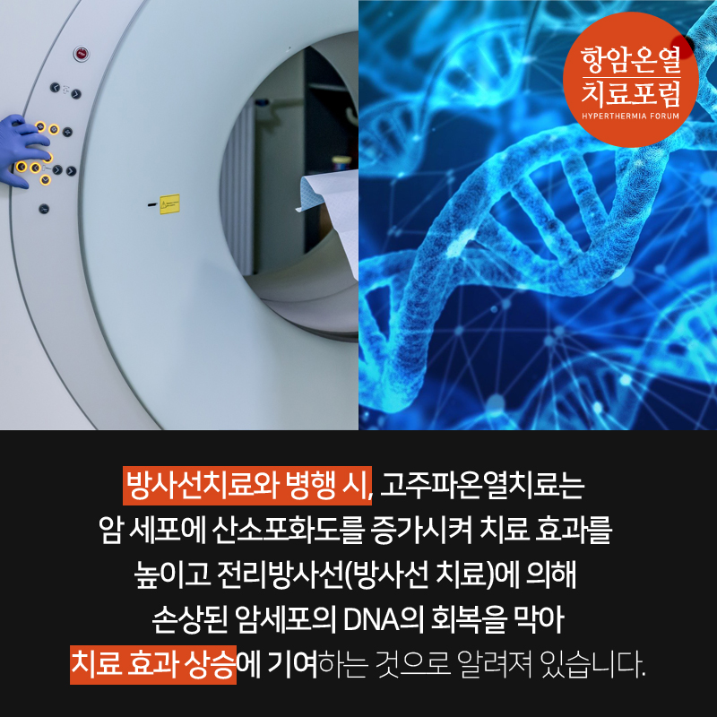 방사선치료와 병행 시, 고주파온열치료는 암 세포에 산소포화도를 증가시켜 치료 효과를 높이고 전리방사선(방사선 치료)에 의해 손상된 암세포의 DNA의 회복을 막아 치료 효과 상승에 기여하는 것으로 알려져 있습니다.