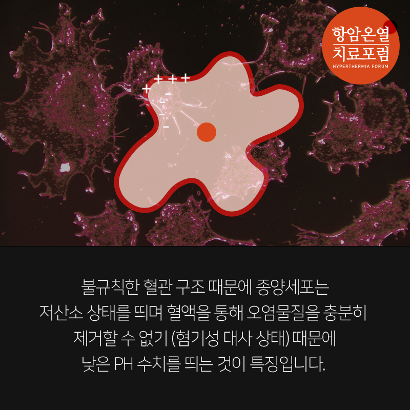 불규칙한 혈관 구조때문에 종양세포는 저산소 상태를 띄며 혈액을 통해 오염물질을 충분히 제거할 수 없기(혐기성 대사 상태) 때문에 낮은 PH 수치를 띄는 것이 특징입니다.