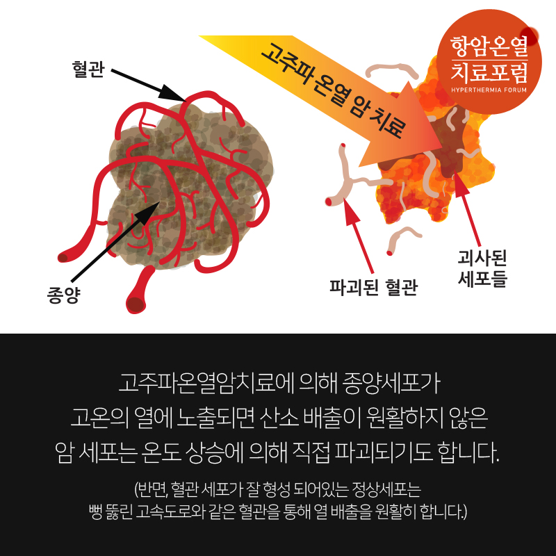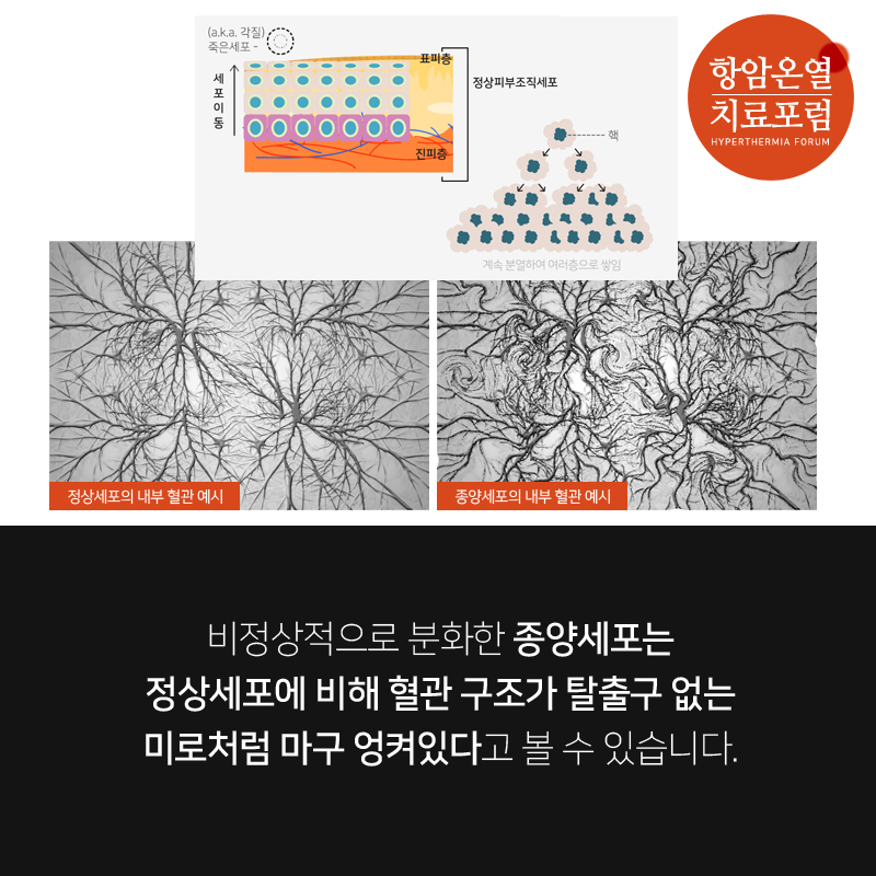(반면, 혈관 세포가 잘 형성 되어있는 정상세포는 뻥 뚫린 고속도로와 같은 혈관을 통해 열 배출을 원활히 합니다.)
