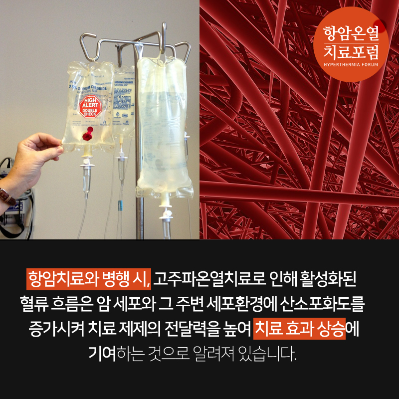항암치료와 병행 시, 고주파온열치료로 인해 활성화된 혈류 흐름은 암 세포와 그 주변 세포환경에 산소포화도를 증가시켜 치료 제재의 전달력을 높여 치료 효과 상승에 기여하는 것으로 알려져 있습니다.