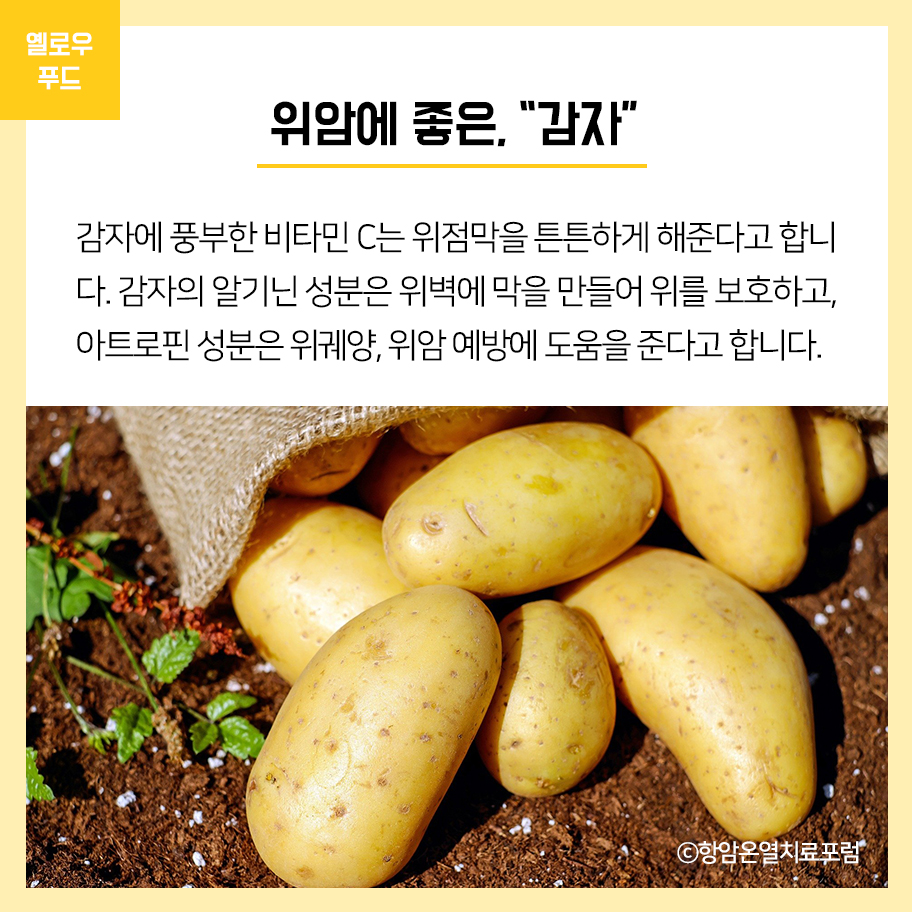 감자의 알기닌 성분은 위벽에 막을 만들어 위를 보호하고, 아트로핀 성분은 위궤양, 위암 예방에 도움을 준다고 합니다.