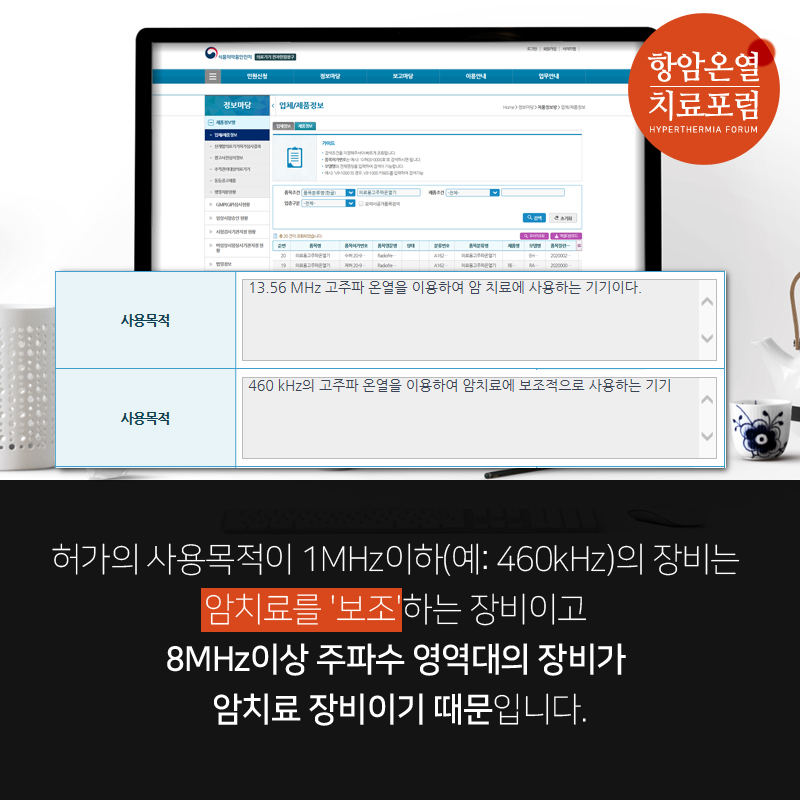 이렇게 구분짓는 이유는 암을 치료하는 많은 의료용고주파온열기(고주파온열치료기의 식품의약품안전처 품목명)가 있지만, 허가의 사용목적이 1MHz이하(예: 460kHz)의 장비는 암치료를 '보조'하는 장비이고 8MHz이상 주파수 영역대의 장비가 암치료 장비이기 때문입니다.