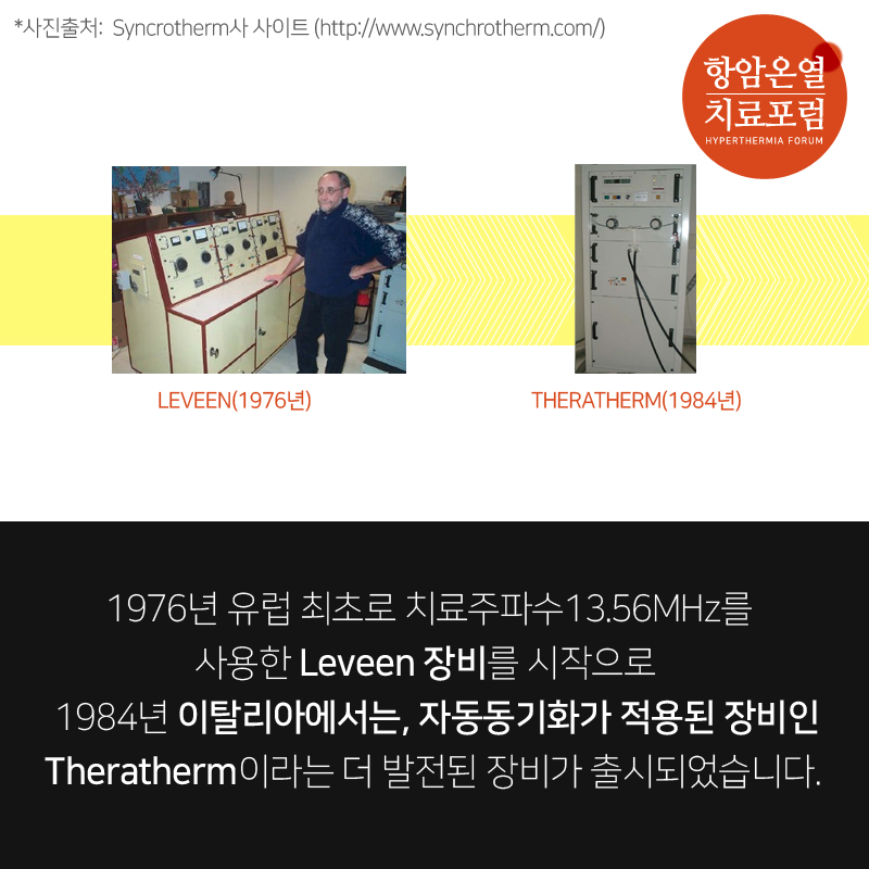 그뒤로 1990년까지 Theratherm장비는 발전을 거듭하다 1998년 Synchrotherm이라는 이름으로 새롭게 출시하였고 그 장비는 오늘날 널리 알려진, 고주파온열암치료기의 원조격으로 볼 수 있습니다.