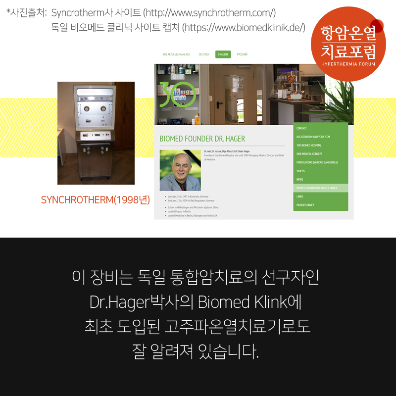 이 장비는 독일 통합암치료의 선구자인 Dr.Hager박사의 Biomed Klink에 최초 도입된 고주파온열치료기로도 잘 알려져 있습니다.
