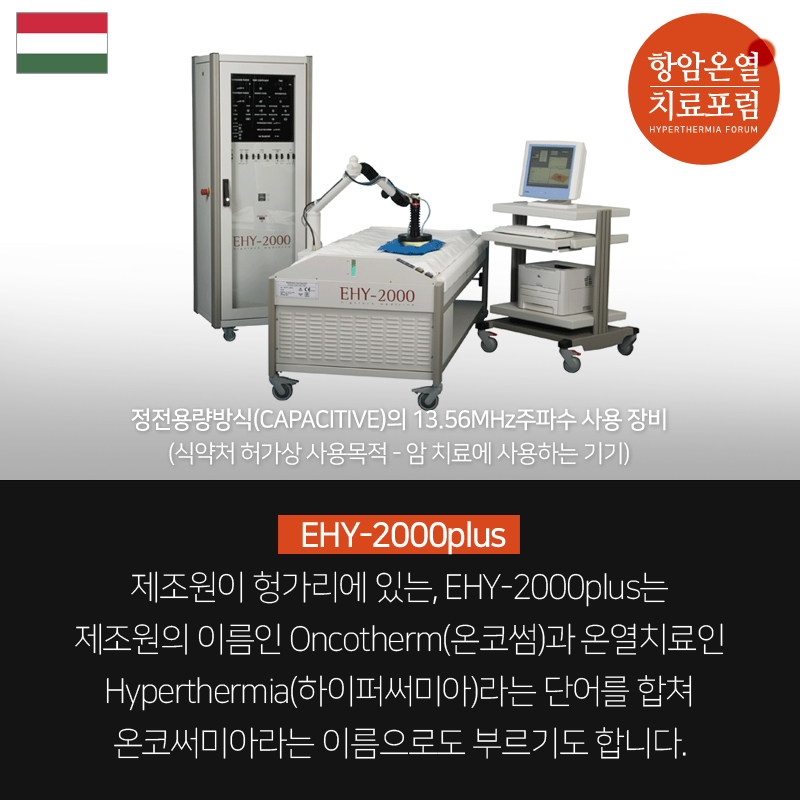 제조원이 헝가리에 있는, EHY-2000plus는 제조원의 이름인 Oncotherm(온코썸)과 온열치료인 Hyperthermia(하이퍼써미아) 라는 단어를 합쳐 온코써미아라는 이름으로도 부르기도 합니다.