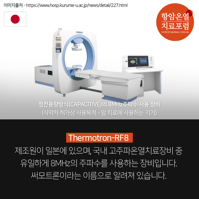 제조원이 일본에 있으며, 국내에서 사용하는 고주파온열장비 중 유일하게 8MHz의 주파수를 사용하는 장비입니다.