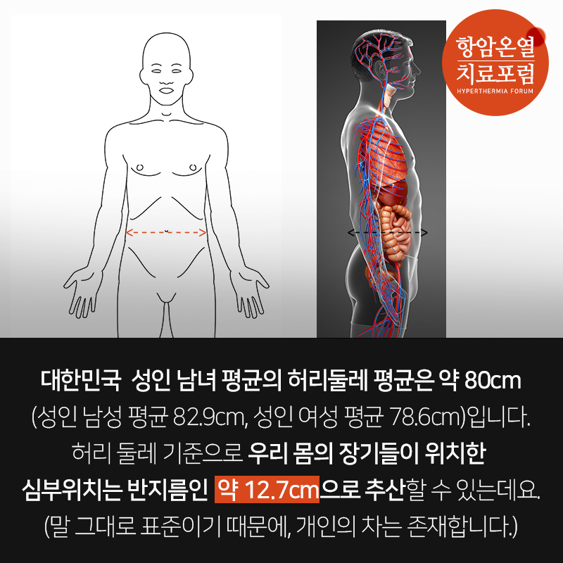 대한민국 성인 남녀 평균의 허리둘레 평균은 약 80cm (성인 남성 평균 82.9cm, 성인 여성 평균 78.6cm)입니다. 허리 둘레 기준으로 우리 몸의 장기들이 위치한 심부위치는 반지름인 약 12.7cm으로 추산할 수 있는데요. (말 그대로 표준이기 때문에, 개인의 차는 존재합니다.)