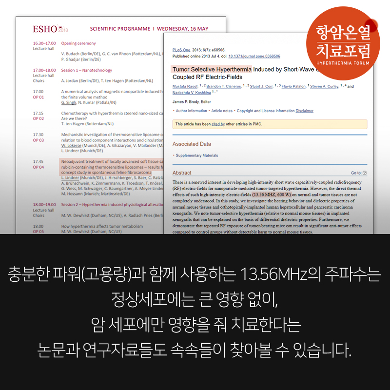 충분한 파워(고용량)과 함께 사용하는 13.56MHz의 주파수는 정상세포에는 큰 영향 없이, 암 세포에만 영향을 줘 치료한다는 논문과 연구자료들도 속속들이 찾아볼 수 있습니다.