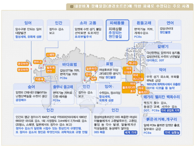 해양생태계 미치는 영향 - 내분비계 장애물질(환경호르몬)에 의한 피해로 추정되는 주요 사례