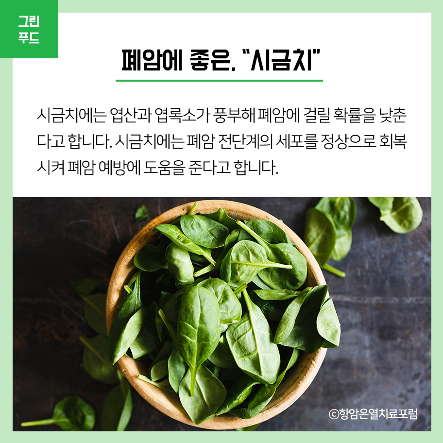 시금치에는 엽산과 엽록소가 풍부해 폐암에 걸릴 확률을 낮춘다고 합니다. 시금치에는 폐암 전단계의 세포를 정상으로 회복시켜 폐암 예방에 도움을 준다고 합니다.