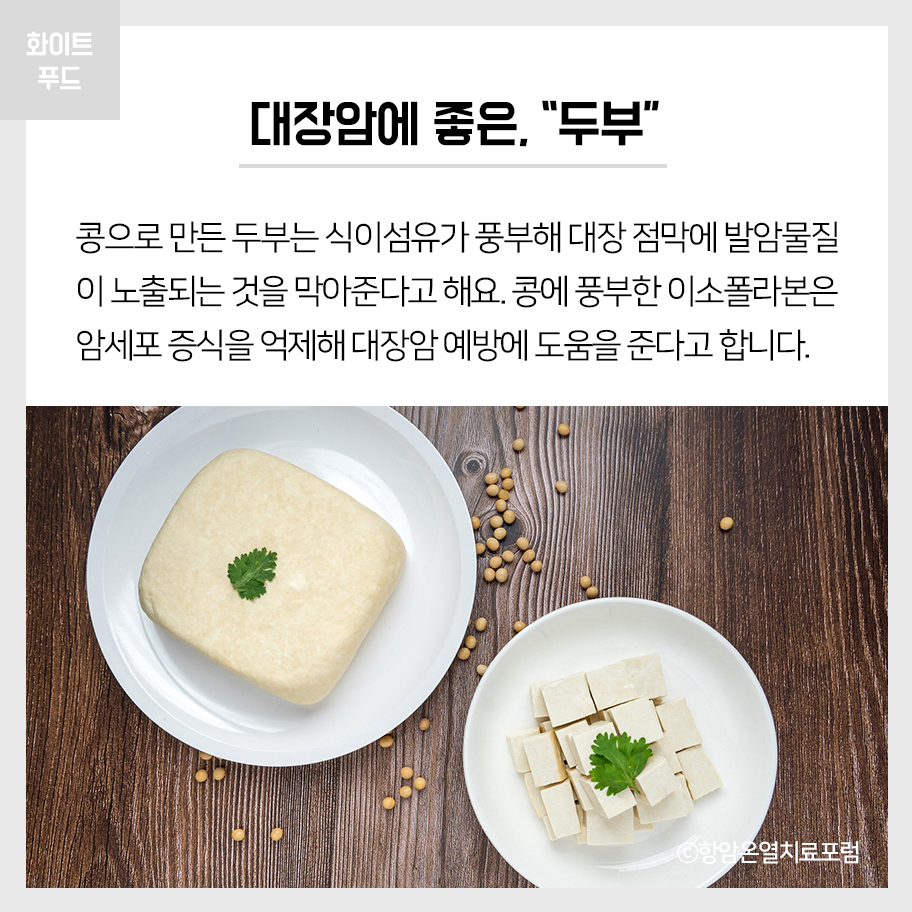 콩으로 만든 두부는 식이섬유가 풍부해 대장 점막에 발암물질이 노출되는 것을 막아준다고 해요. 콩에 풍부한 이소폴라본은 암세포 증식을 억제해 대장암 예방에 도움을 준다고 합니다.