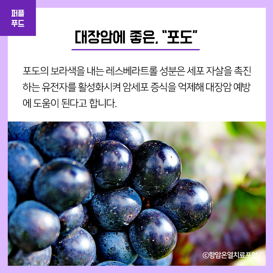 포도의 보라색을 내는 레스베라트롤 성분은 세포 자살을 촉진하는 유전자를 활성화시켜 암세포 증식을 억제해 대장암 예방에 도움이 된다고 합니다.