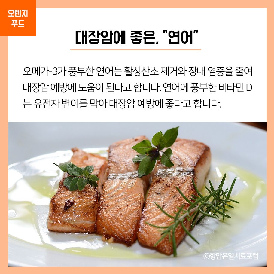 오메가-3가 풍부한 연어는 활성산소 제거와 장내 염증을 줄여 대장암 예방에 도움이 된다고 합니다. 연어에 풍부한 비타민 D는 유전자 변이를 막아 대장암 예방에 좋다고 합니다.