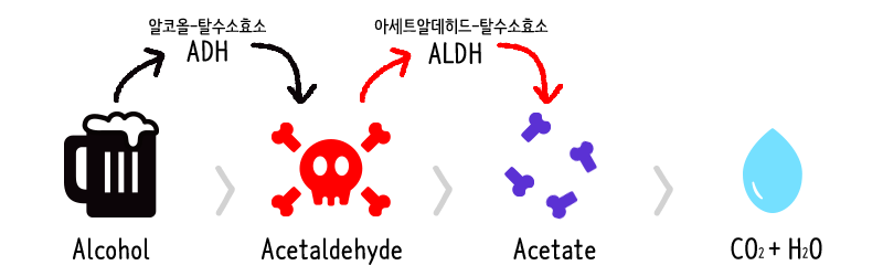 * 알코올 대사 과정 : 체내 흡수된 알코올은 분해 효소에 의해 아세트 알데하이드로 전환 후 다시 분해 효소에 의해 아세트산으로 전환되고 또다시 아세트산이 분해되며 이산화탄소와 물로 바뀌어 몸 밖으로 배출됩니다.