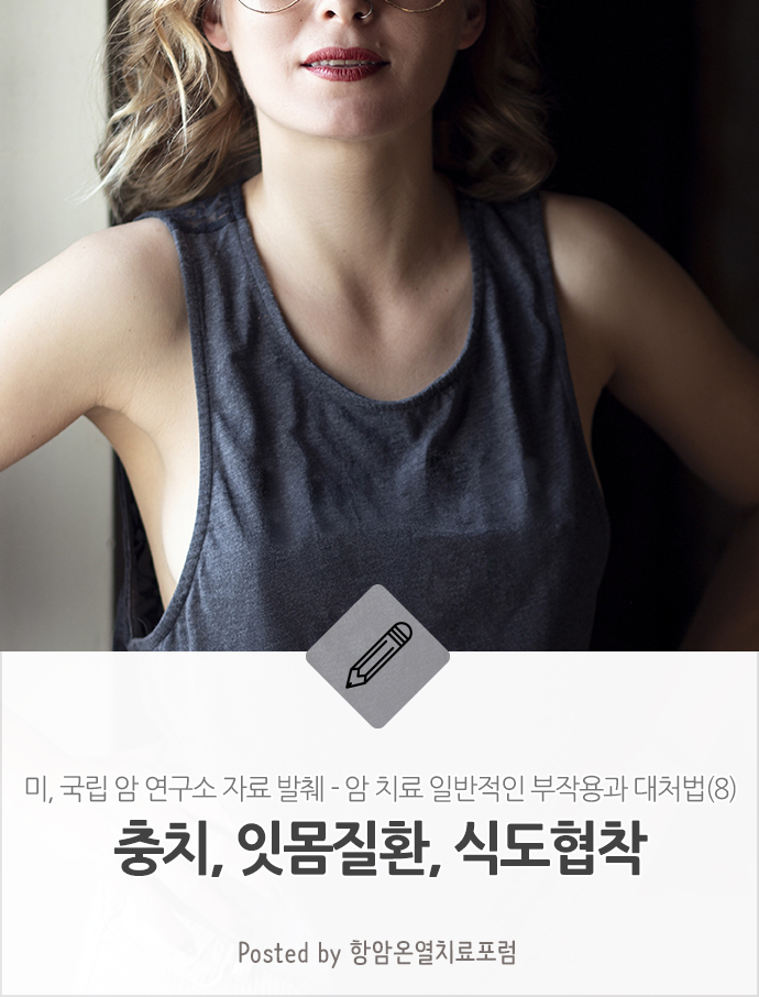 암 치료에는 여러 가지 부작용이 따릅니다. 빠른 회복을 위해 영양공급이 중요한 만큼 음식 섭취는 매우 직접적이면서도 중요한 일입니다. 이렇게 음식 섭취가 중요하지만, 암 치료 후 충치나 잇몸질환으로 불편감을 얹을 수 있고 이로 인한(특히, 잇몸염증) 또다른 후유증을 야기하기도합니다. 만들기도합니다. 특정 암의 수술이나 방사선 치료 후에는 식도 협착이 나타날 수 있는데요. 이는 암환자의 영양공급에 직접적인 곤란 사유가 됩니다. 암치료 후 나타날 수 있는 충치와 잇몸질환 그리고 식도 좁아짐에 대해 예방이나 완화할 수 있는 정보를 미리알아둔다면 환자의 회복과 치료 효과에 도움이 된다고 합니다. 암 치료와 회복관리를 위해 미국 국립 암 연구소에서 환자를 대상으로 한 무료 배포 자료인 Cancer Resource를 참고하여, 암 치료 중 발생할 수 있는 일반적인 부작용과 대처법에 대해 정리/소개해 드리는 마지막 포스팅입니다.