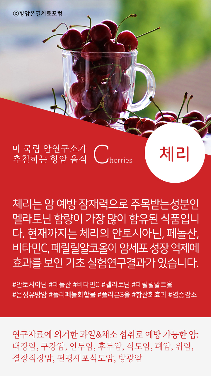 체리는 암 예방 잠재력으로 주목받는성분인 멜라토닌 함량이 가장 많이 함유된 식품입니다. 현재까지는 체리의 안토시아닌, 페놀산, 비타민C, 페릴릴알코올이 암세포 성장 억제에 효과를 보인 기초 실험연구결과가 있습니다.