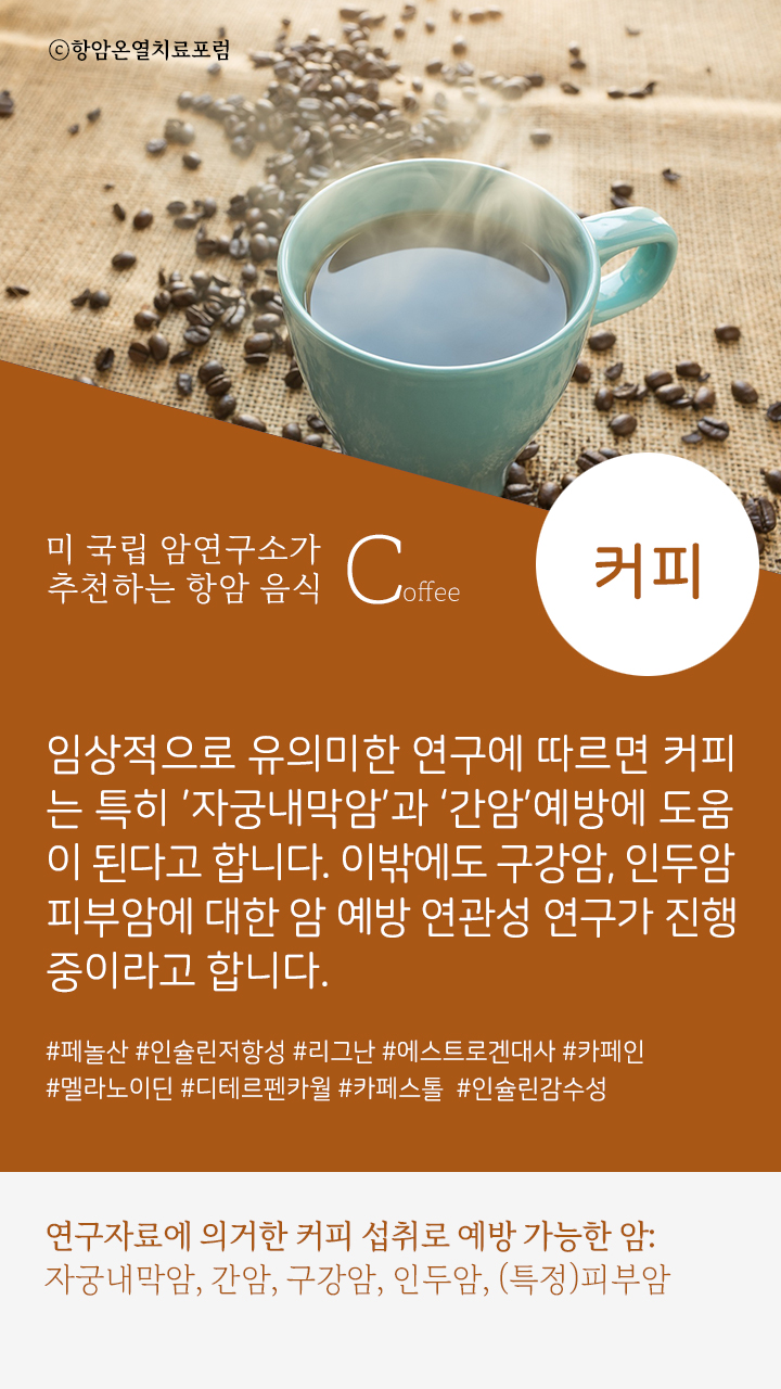 임상적으로 유의미한 연구에 따르면 커피는 특히 ’자궁내막암’과 ‘간암’예방에 도움이 된다고 합니다.