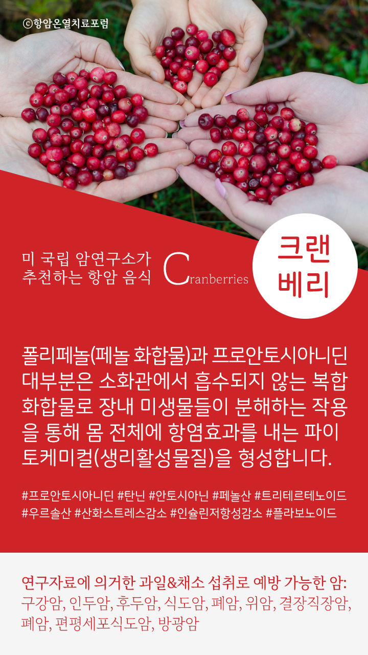 → 크랜베리 속 암 예방 성분 #프로안토시아니딘 #탄닌 #안토시아닌 #페놀산 #트리테르테노이드 #우르솔산 # 플라보노이드
