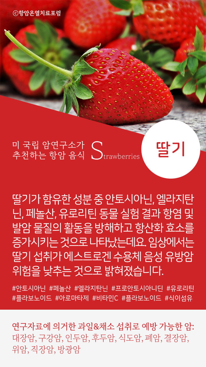 → 딸기 속 암 예방 성분: #안토시아닌 #페놀산 #엘라지탄닌 #프로안토시아니딘 #유로리틴 #플라보노이드 #아로마타제 #비타민C #플라보노이드 #식이섬유