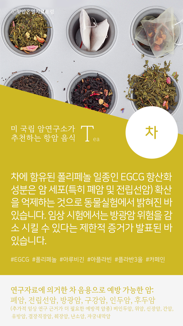 → 차(녹차, 홍차) 속 암 예방 성분: #EGCG #폴리페놀 #아루비긴 #아플라빈 #플라반3올 #카페인