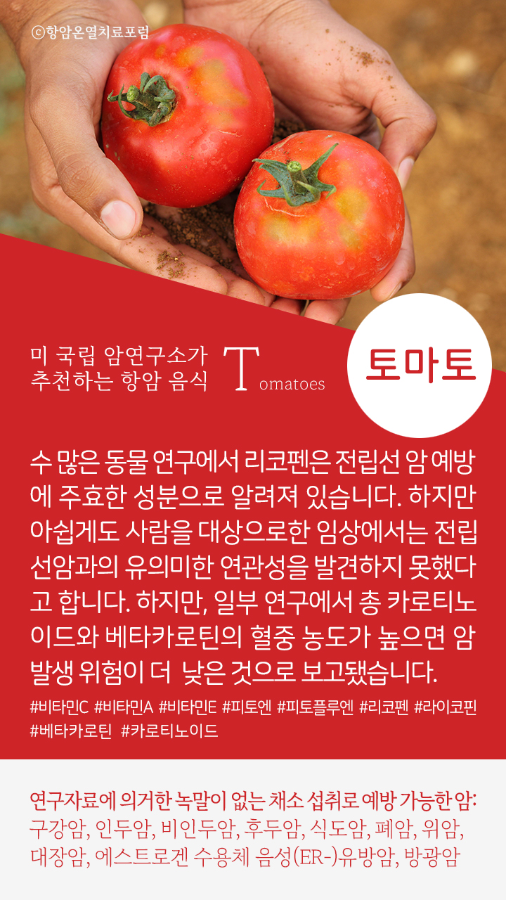 → 토마토 속 암 예방 성분: #비타민C #비타민A #비타민E #피토엔 #피토플루엔 #리코펜 #라이코핀 #베타카로틴 #카로티노이드