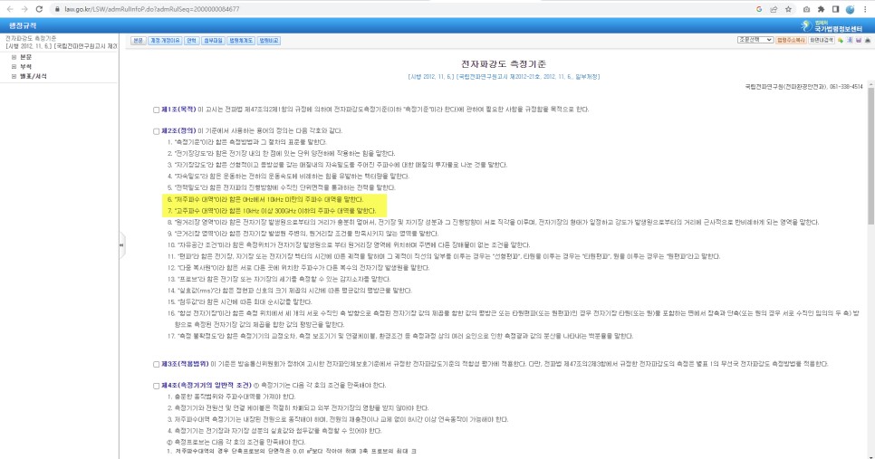 고주파는 상대적 개념일 수 있으므로, 국립전파연구원 고시사항에 따라 전자파강도 측정기준 제2조(정의) 6항과 8항에 따르면,