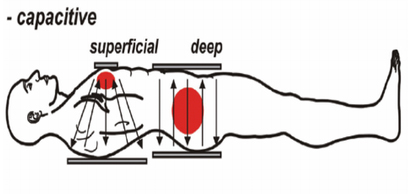 13.56MHz 주파수를 전극을 이용해 내보내는 방식인데요- 이 방식에서도 위아래 전극이 있는 양전극이냐, 위에만 전극있고 하부는 침대와 같은 구조로 되어있는 단전극으로 구분해 설명할 수 있습니다.