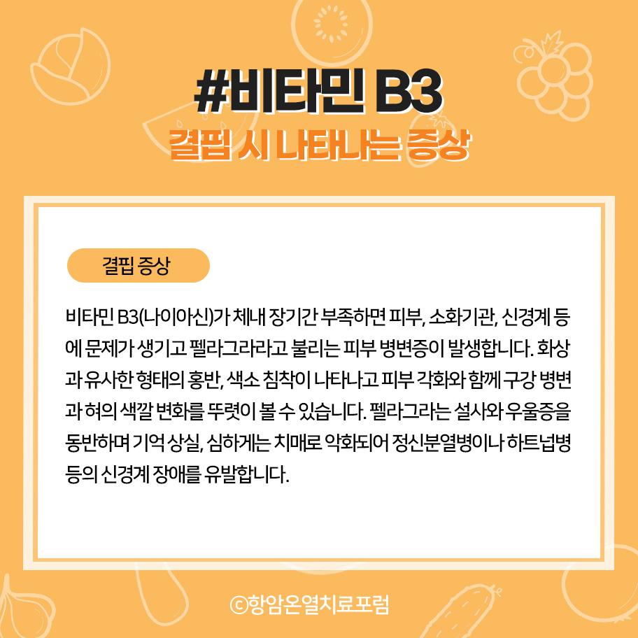 비타민 B3(나이아신)가 체내 장기간 부족하면 피부, 소화기관, 신경계 등에 문제가 생기고 펠라그라라고 불리는 피부 병변증이 발생합니다. 화상과 유사한 형태의 홍반, 색소 침착이 나타나고 피부 각화와 함께 구강 병변과 혀의 색깔 변화를 뚜렷이 볼 수 있습니다. 펠라그라는 설사와 우울증을 동반하며 기억 상실, 심하게는 치매로 악화되어 정신분열병이나 하트넙병 등의 신경계 장애를 유발합니다.