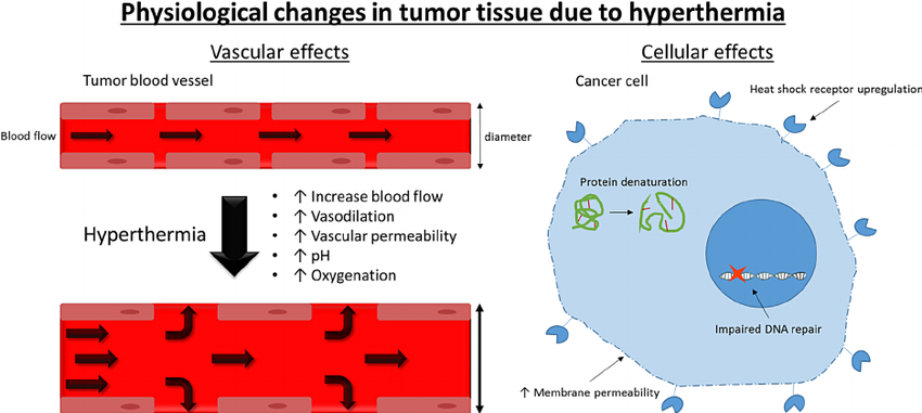 온도가 상승함에 따라 종양세포의 DNA 복제는 느려지거나 심지어 완전히 멈출 수 있다. 온열치료를 계속하고 나면, 혈관의 내피세포가 팽창하고 미세혈전이 생김에 따라 종양 조직안 혈류가 꾸준히 감소한다. 이에 따라 모세 혈관이 완전히 파괴될 수 있다. 이런 효과를 지칭하여 혈관신생 차단(Blocks Angiogenesis)이라 한다.