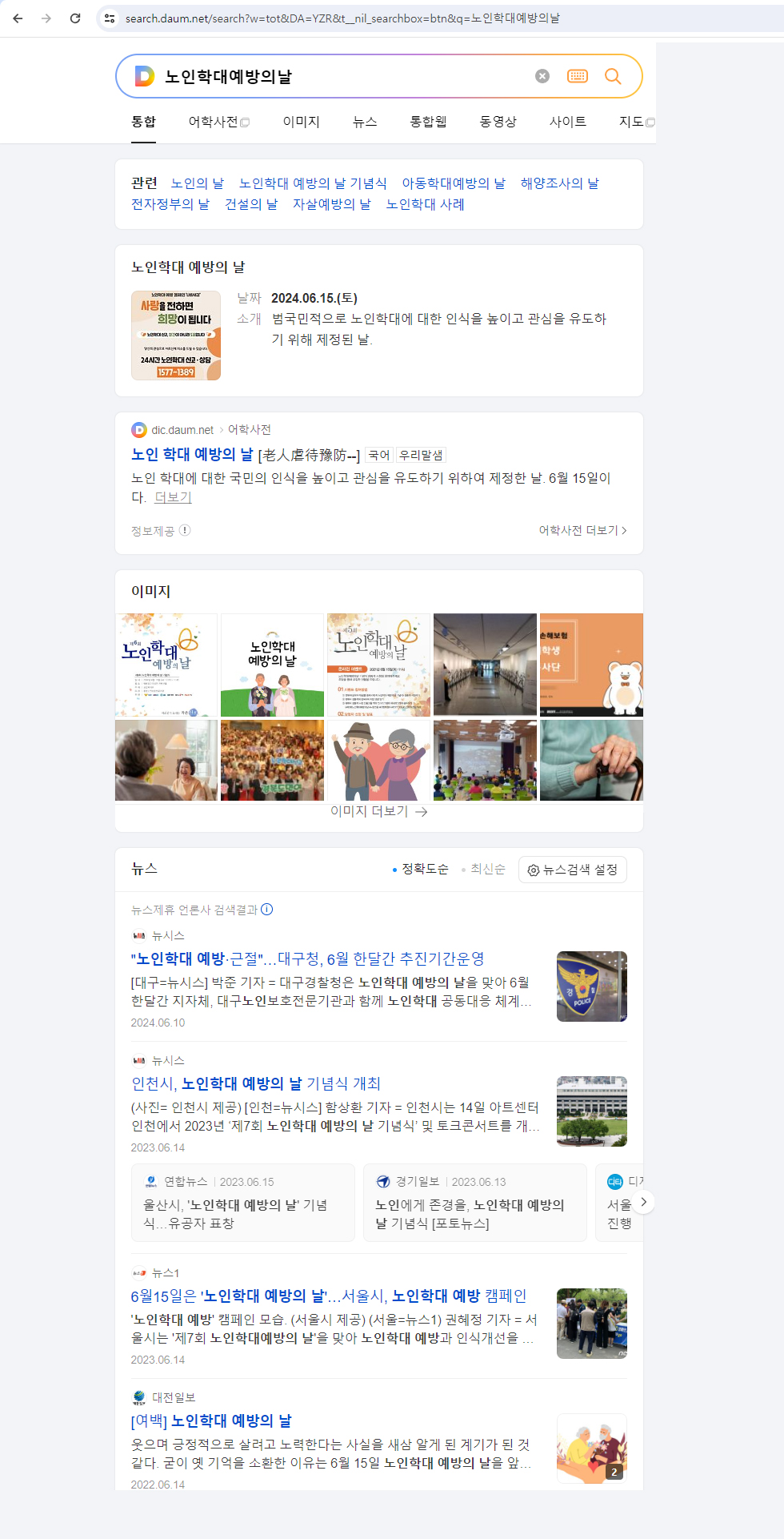 매년 6월 15일은 노인학대 예방의 날로 노인 인권을 보호하고 노인 학대를 예방하기 위해 노인복지법에 따라 제정한 법정 기념일인데요. 우리 다음 포털에 검색한 결과 다른 법정 기념일에 비해 다소, 빈약한 소개와 설명이 아닌가 싶었어요.