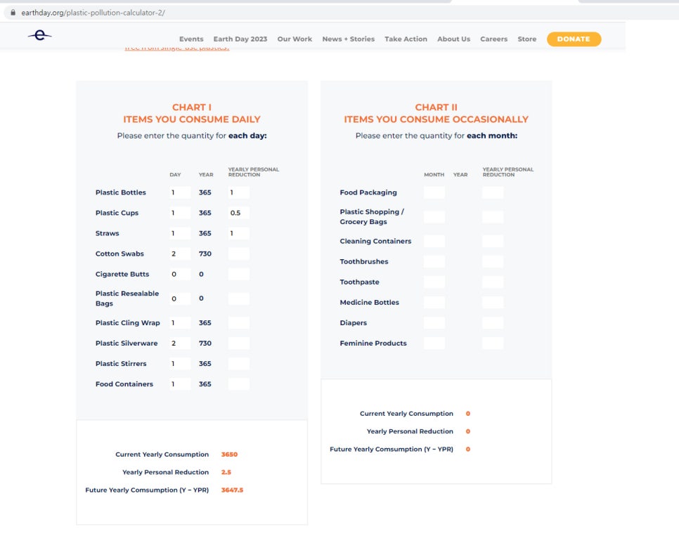 플라스틱 소비량 계산해 보러 가기> https://www.earthday.org/plastic-pollution-calculator-2/