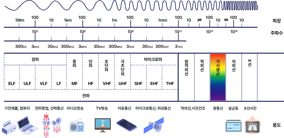 [그림1]은 국제전기통신연합(ITU)에서 파장 및 주파수 대역 별로 전파를 구분하고 그에 따른 산업에서 해당 전파를 어떻게 활용하는 지 보여준다.