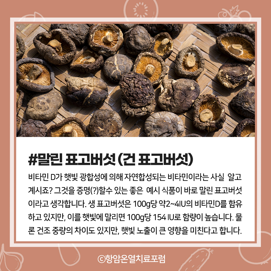 비타민 D가 햇빛 광합성에 의해 자연합성되는 비타민이라는 사실 알고 계시죠? 그것을 증명(?)할 수 있는 좋은 예시 식품이 바로 말린 표고버섯이라고 생각합니다. 생 표고버섯은 100g당 약 2~4IU의 비타민D를 함유하고 있지만, 이를 햇빛에 말리면 100g당 154 IU로 함량이 높습니다. 물 론 건조 중량의 차이도 있지만, 햇빛 노출이 큰 영향을 미친다고 합니다.