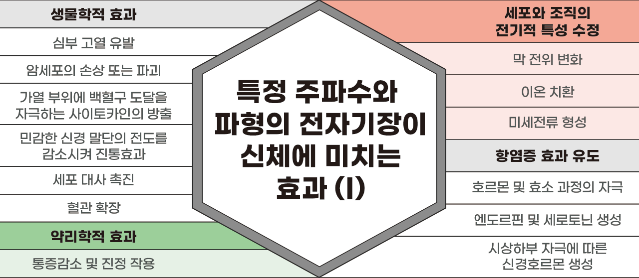 위에서 우리는 특정 주파수와 파형의 전자기장이 염증을 줄이고 다양한 종류의 세균 및 바이러스의 감염 확산을 막는 매우 유망한 효과를 유도할 수 있다는 것을 살펴보았으며, 이러한 효과는 크게 다음 [표 1]과 [표 2]의 유형으로 분류될 수 있다.