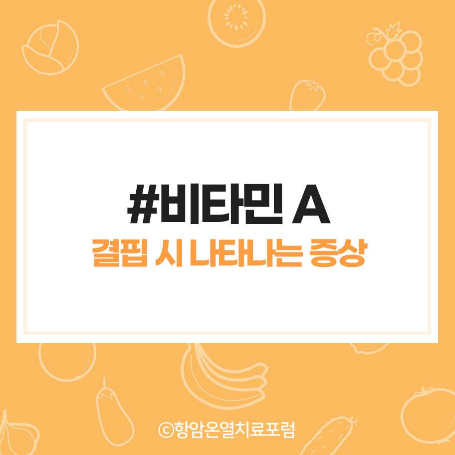 비타민 A가 부족하면 야맹증과 안구건조증(xerophthalmia), 각막연화증이 발생하며 눈에 이상이 생겨 암 적응 능력이 저하됩니다. 한편 비타민 A 섭취가 지나칠 때 두통, 피부 건조 및 가려움, 간장 비대 등이 나타납니다. 특히 임신기에 비타민 A를 과다하게 섭취하면 사산, 출생 기형 등이 나타날 수 있습니다. 또 지방질 섭취 부족 및 흡수 불량, 단백질 부족, 호흡기 질환 등과 함께 나타날 수 있습니다.