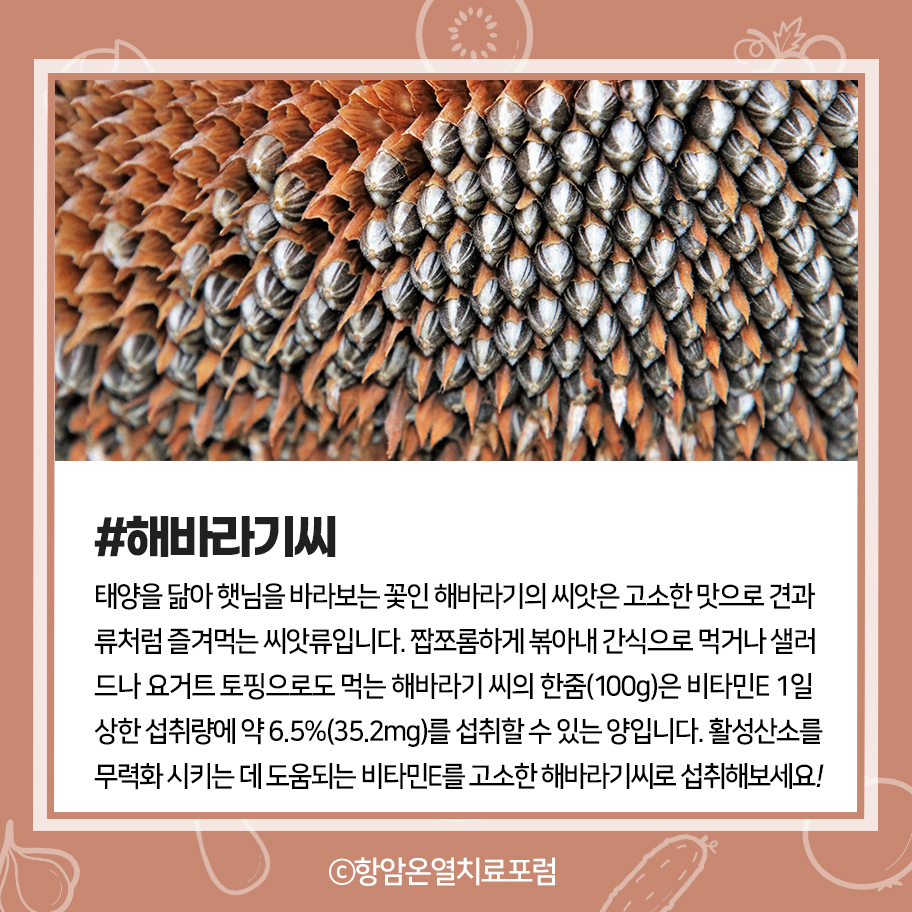 태양을 닮아 햇님을 바라보는 꽃인 해바라기의 씨앗은 고소한 맛으로 견과 류처럼 즐겨먹는 씨앗류입니다. 짭쪼롬하게 볶아내 간식으로 먹거나 샐러 드나 요거트 토핑으로도 먹는 해바라기 씨의 한줌(100g)은 비타민E 1일 상한 섭취량에 약 6.5%(35.2mg)를 섭취할 수 있는 양입니다. 활성산소를 무력화 시키는 데 도움되는 비타민E를 고소한 해바라기씨로 섭취해보세요!