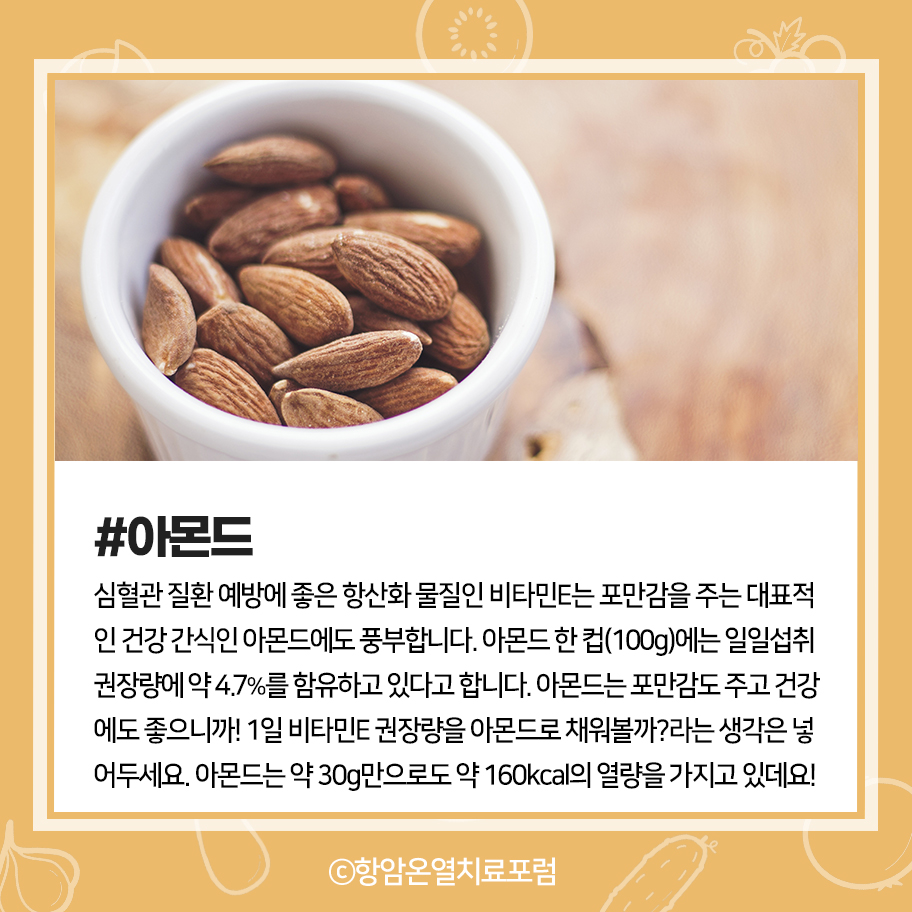 심혈관 질환 예방에 좋은 항산화 물질인 비타민E는 포만감을 주는 대표적 인 건강 간식인 아몬드에도 풍부합니다. 아몬드 한 컵(100g)에는 일일섭취 권장량에 약 4.7%를 함유하고 있다고 합니다. 아몬드는 포만감도 주고 건강 에도 좋으니까! 1일 비타민E 권장량을 아몬드로 채워볼까?라는 생각은 넣 어두세요. 아몬드는 약 30g만으로도 약 160kcal의 열량을 가지고 있데요!
