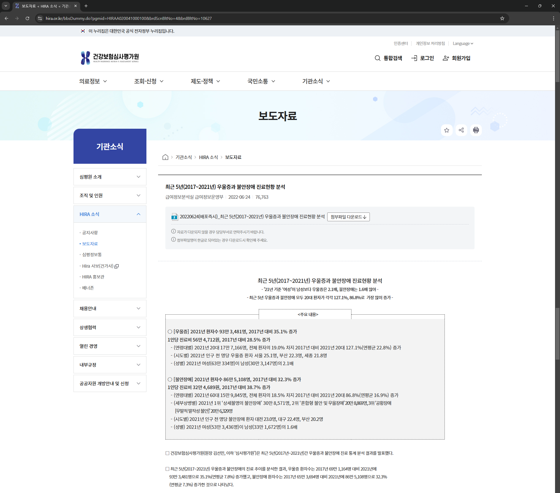건강보험심사평가원에서 최근 5년(2017년~2021년) 간 우울증과 불안장애 진료현황 통계 분석 결과를 발표한 가운데, 2021년 불안장애 환자수가 86만 5,108명으로 2017년 대비 32.3% 증가한 것으로 나타났습니다.