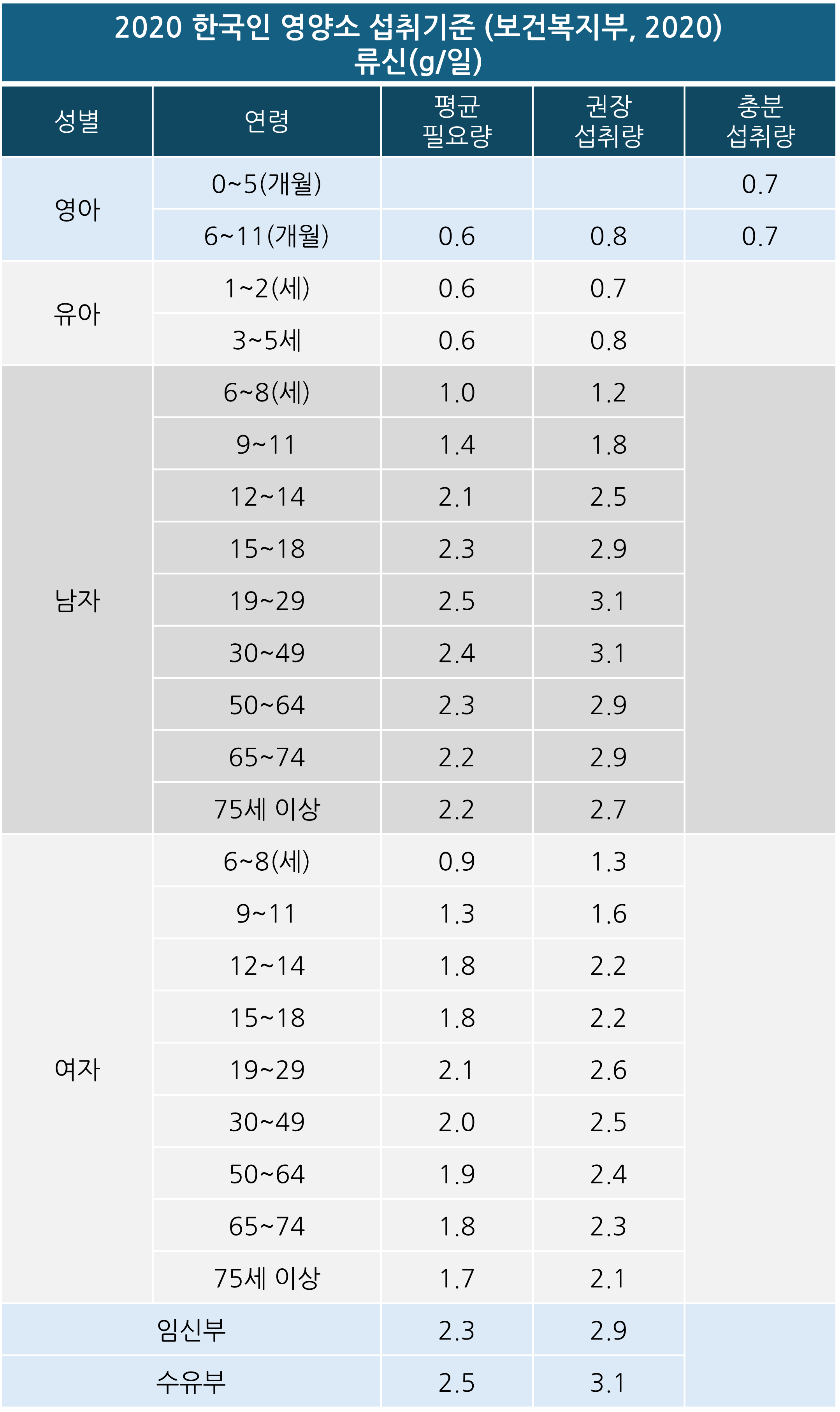 라이신의 하루 권장 섭취량「2020 한국인 영양소 섭취기준」에 따르면 19세 이상 성인 남성의 평균 필요량은 2.5g/일, 권장섭취량은 3.4g/일, 19세 이상 성인 여성의 평균 필요량은 2.1g/일, 권장 섭취량은 2.6g/일로 밝혔습니다. 각 연령대과 성별로 1일 필요/권장 다르지만 0-5개월은 0.7g/일의 필요섭취량은 6개월~만5세까지 평균 필요량은 0.6g/일으로 동일했습니다. 각 연령대별 필요/권장량은 별도로 첨부한 표의 정보를 확인해 주세요!