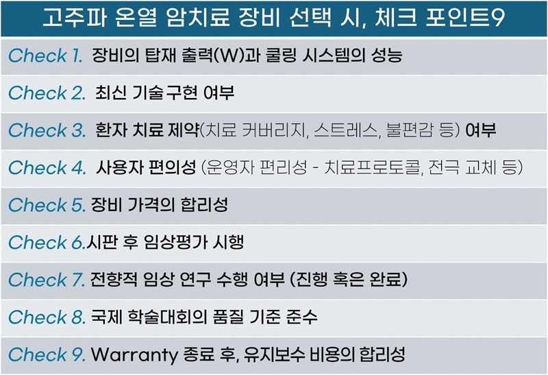 마지막으로 정전용량 방식의 고주파 온열 암 치료 장비의 선택 기준에서 아래에 나열한 체크포인트를 반드시 살펴보고 확인해야 온열 암 치료를 수행하는 병원 입장 또는 치료를 받아야 하는 환자의 입장에서 최선의 합리적인 선택이 될 수 있다는 것이 필자의 의견이다.