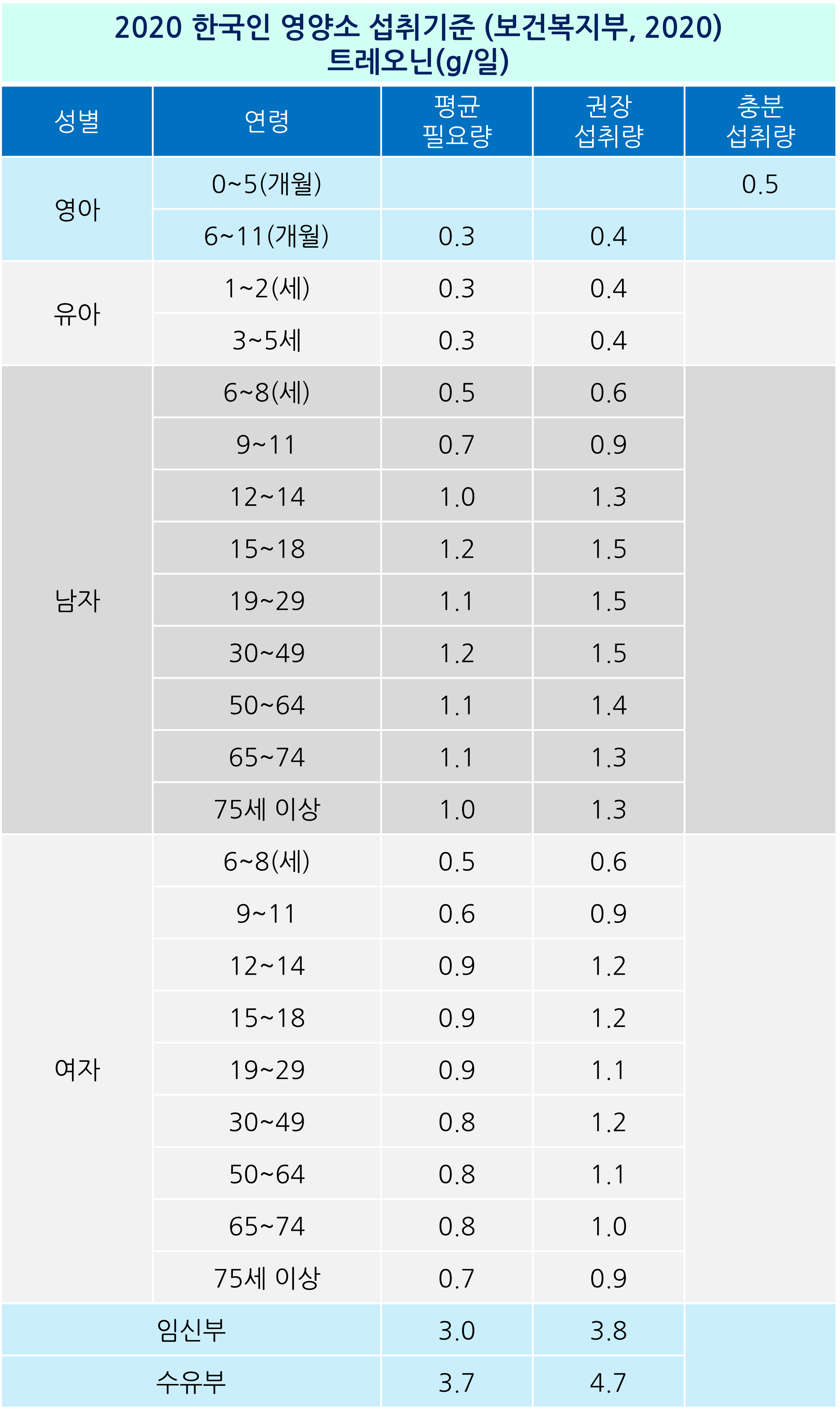 트레오닌의 하루 권장 섭취량「2020 한국인 영양소 섭취기준」에 따르면 19세 이상 성인 남성의 평균 필요량과 권장 섭취량은 1.1g/일, 권장 섭취량은 1.5g 19세 이상 성인 여성의 평균 필요량은 0.9/일, 권장 섭취량은 1.1g로 밝혔습니다. 각 연령대와 성별로 1일 필요/권장량은 다르지만 영아기인 06개월부터 유아기인 만5세까지는 평균 필요량은 0.3g/일 권장 섭취량 0.4g/일 으로 동일했습니다. 수유부의 경우 가장 많은 양인 일 4.7g을 섭취할 것을 권장하고 있었는데요. 이밖에 각 연령대별 필요/권장량은 별도로 첨부한 표의 정보를 확인해 주세요!