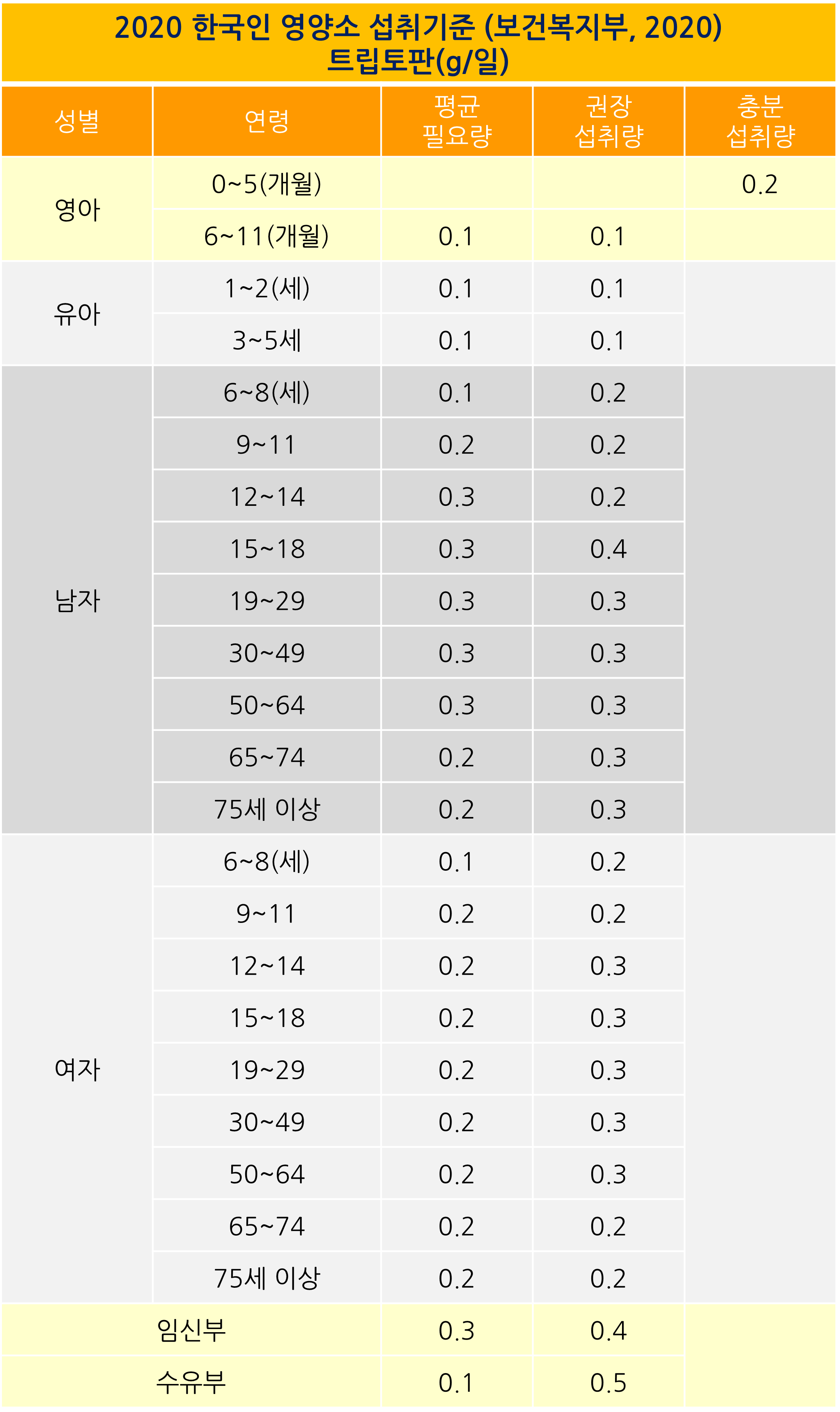 트립토판의 하루 권장 섭취량「2020 한국인 영양소 섭취기준」에 따르면 19세 이상 성인 남성의 평균 필요량과 권장 섭취량은 0.3g/일, 19세 이상 성인 여성의 평균 필요량은 0.2/일, 권장 섭취량은 0.3g로 밝혔습니다. 각 연령대와 성별로 1일 필요/권장량은 다르지만 영아기인 06개월부터 유아기인 만5세까지는 평균 필요량과 권장 섭취량 모두 0.1g/일 으로 동일했습니다. 수유부의 경우 가장 많은 양인 일 0.5g을 섭취할 것을 권장하고 있었는데요. 이밖에 각 연령대별 필요/권장량은 별도로 첨부한 표의 정보를 확인해 주세요!