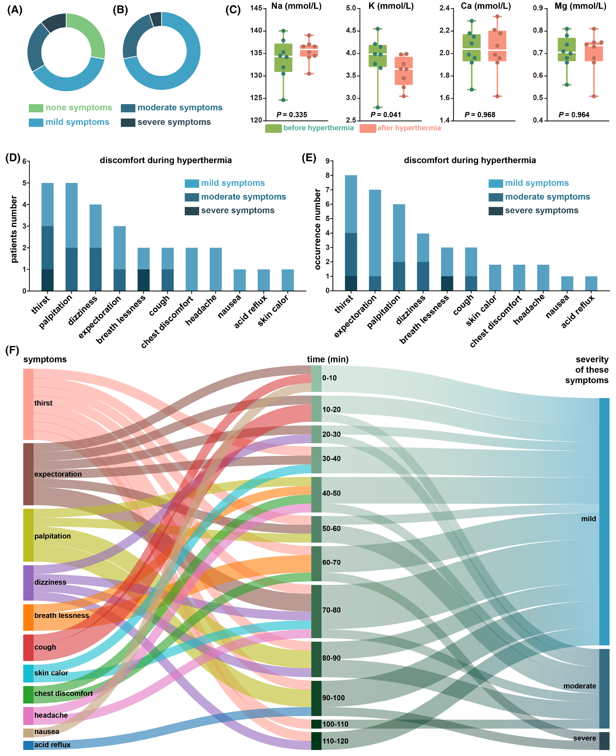 [그림 4] (B)에서 볼 수 있듯이 93건의 온열치료 세션 중 39회(41.9%)에서 온열요법 관련 불편 증상이 나타났다. 가장 흔하게 보고된 이상 반응(AE)은 과도한 발한으로 인한 갈증이었으며, 과도한 발한 증상을 일으킨 환자의 경우 [그림 4] (C)와 같이 온열치료 전후에 주요 전해질 변화가 관찰되었다. 갈증 외에 일반적인 부작용으로는 심계항진, 객담(가래), 현기증이 있으며, 이는 조절 가능한 범위의 반응이다([그림 4] (D), (E) 참조).