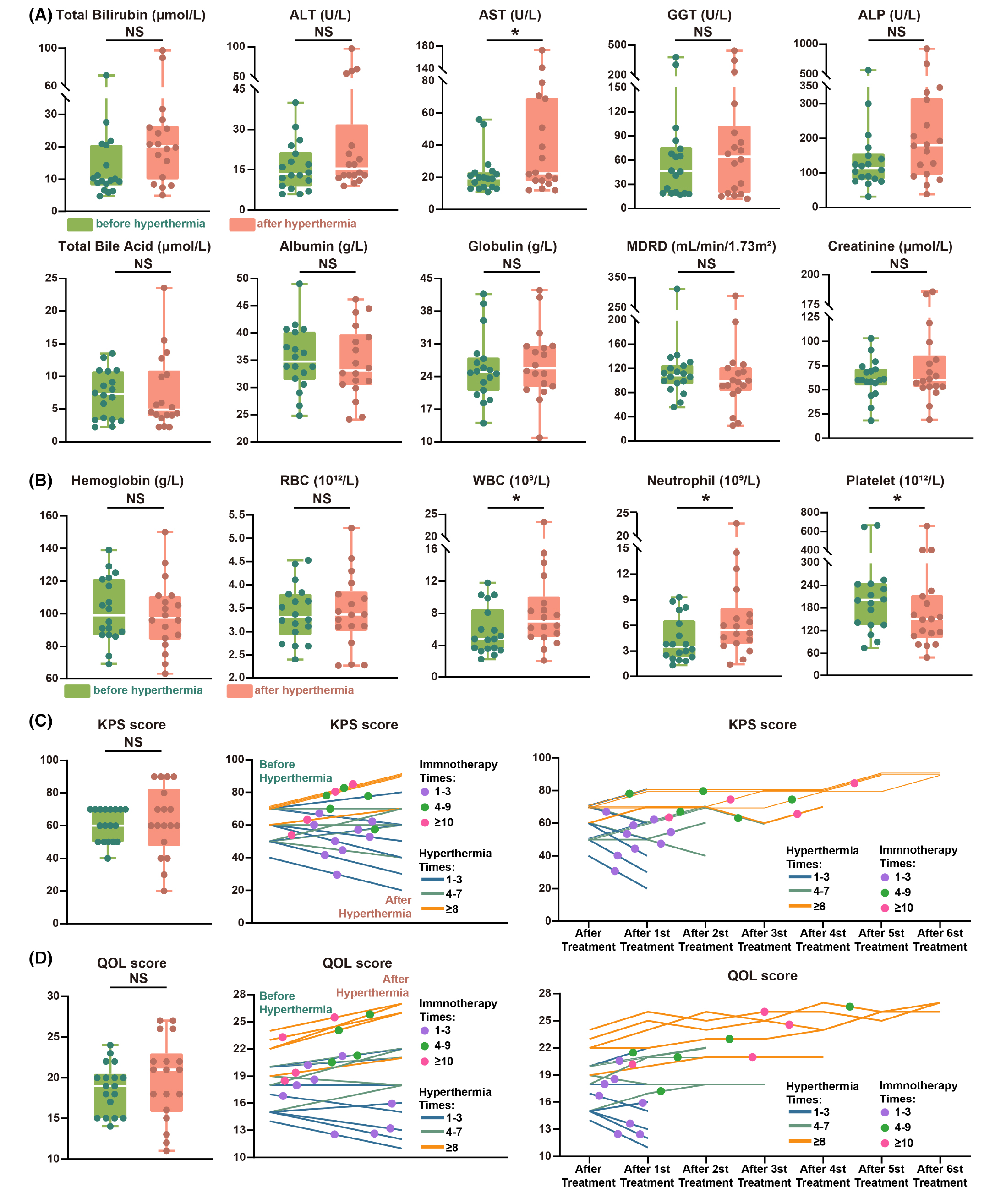 온열요법과 관련된 부작용 측면의 평가 외에도, [그림 1] (A), (B)에 제시된 바와 같이 온열치료 전후의 다양하고 중요한 혈액 지표의 변화도 기록했다. 또한, 온열요법 전후의 KPS와 QOL점수를 조사한 결과([그림4] (C), (D) 참조) 두 점수 모두 개선되었지만, 통계적으로 유의미한 차이는 없었다.