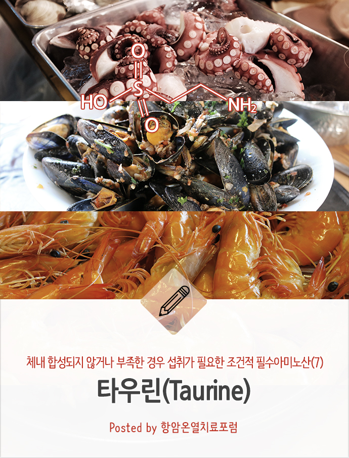 아미노산은 단백질 분자의 가장 기본적인 조성 물질을 말하며 크게 필수 아미노산과 비필수 아미노산으로 나뉘어 집니다. '필수 아미노산'이라 함은 체내에서 합성되지 않고 반드시 식품으로 섭취해야 되는 아미노산으로 류신, 라이신, 메티오닌, 발린, 이소류신, 트레오닌, 트립토판, 페닐알라닌 등 8가지가 전통적으로 구분했습니다. 과거 히스티딘을 유아기에만 더하는 준필수 아미노산으로 보았지만, 최근 들어서는 성인에게서도 필수 아미노산으로 포함하고 있습니다. (근거: 2020 한국인 영양소 섭취기준-에너지와 다량영양소 편) '비필수 아미노산'으로는 글리신, 알라닌, 세린, 아스파라긴산, 글루탐산, 프롤린, 옥시프롤린, 아르기닌, 시스틴, 히스티딘, 티로신 등이 있습니다. 반드시 섭취가 필요한 것은 아니지만, 체내 합성량이 대사적 요구량을 충족시키지 못할 경우 식이를 통한 공급이 필요한 아미노산이, 바로 조건적 필수아미노산이며 오늘 소개할 타우린이 이에 해당합니다. 타우린(Taurine)은 아미노산의 일종이자, 시스틴의 대사산물로 지방 대사에 주요한 물질로, 사람을 포함한 동물의 조직(심장, 뇌, 간 등)에 흔히 있는 유기산으로 식물성 단백질에서는 찾아볼 수 없는 성분입니다. 현재까지 밝혀진 타우린의 생리기능은 뇌의 교감신경에 대해 억제작용을 나타내어 혈압의 안정화 및 뇌졸중의 예방에 도움이 된다고 합니다. 또한, 심장의 저칼슘 상태에 따른 심근의 수축력이 저하할 때 수축력을 증가시키고, 역으로 고칼슘의 경우 수축력을 감소시켜 부정맥이나 심부전에 유효하다고 알려져 있습니다. 이 밖에 동맥경화·협심증 · 심근경색 등을 유발하는 저밀도 지단백질(LDL) 콜레스테롤의 생성을 억제하고, 혈관 조직에 침투되어 있는 콜레스테롤을 분해시키는 고밀도 비단백질(HDL) 콜레스테롤의 양을 증가시켜, 혈관 내 혈소판 응집작용 뿐만 아니라 각종 혈관계 질환의 예방에 효과가 있다고 알려져 있습니다. 또한 식품첨가물의 하나로 영양강화제인 자양강장제·피로회복제 등 드링크 제품의 주성분으로 잘 알려져 있습니다.