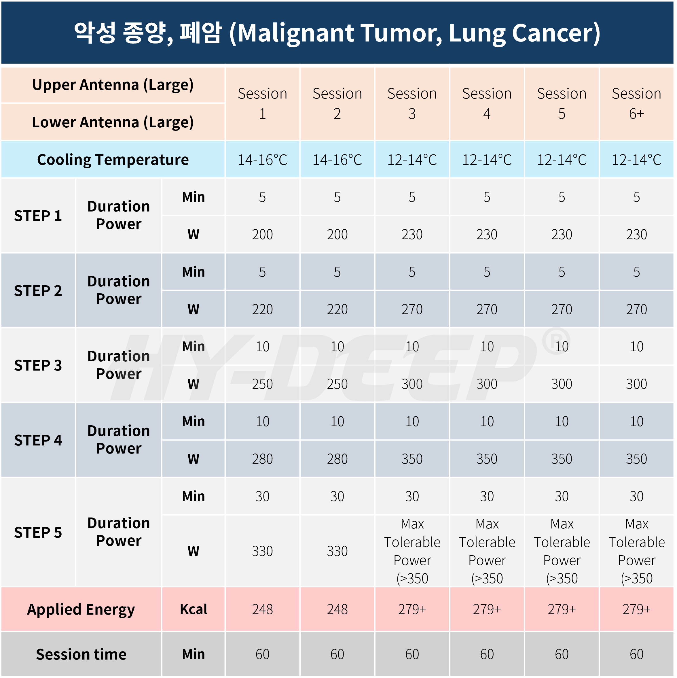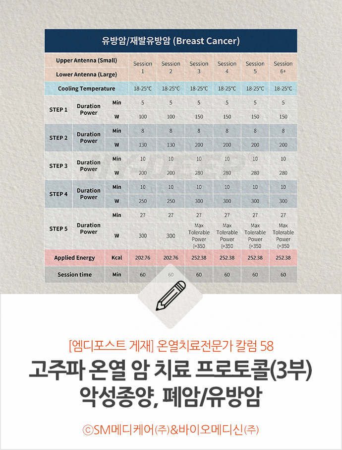칼럼 56편에서는 20년 전부터 현재까지 암 환자 치료에 병행 사용해 온 우리나라의 고주파 온열 암 치료가 종합적인 표준지침을 마련하지 못한 현실에 대한 안타까움은 전했다. 이에, 제대로 된 온열 암 치료 프로토콜을 갖추고 있는 하이딥600WM 장비의 치료 가이드라인과 표준 프로토콜 제정을 촉구하는 마음으로, 해당 내용을 전하는 칼럼을 지난주부터 전하고 있다. 지난 편에서는 고주파 온열 암 치료 사이클과 세션, 열 내성 현상을 비롯해 나타날 수 있는 부작용에 대해 알렸다면, 오늘부터는 장비에 탑재된 암종별 치료 프로토콜과해당 종양 치료 시 세션별 출력 및 냉각 온도 가이드라인에 대해 전하겠다.