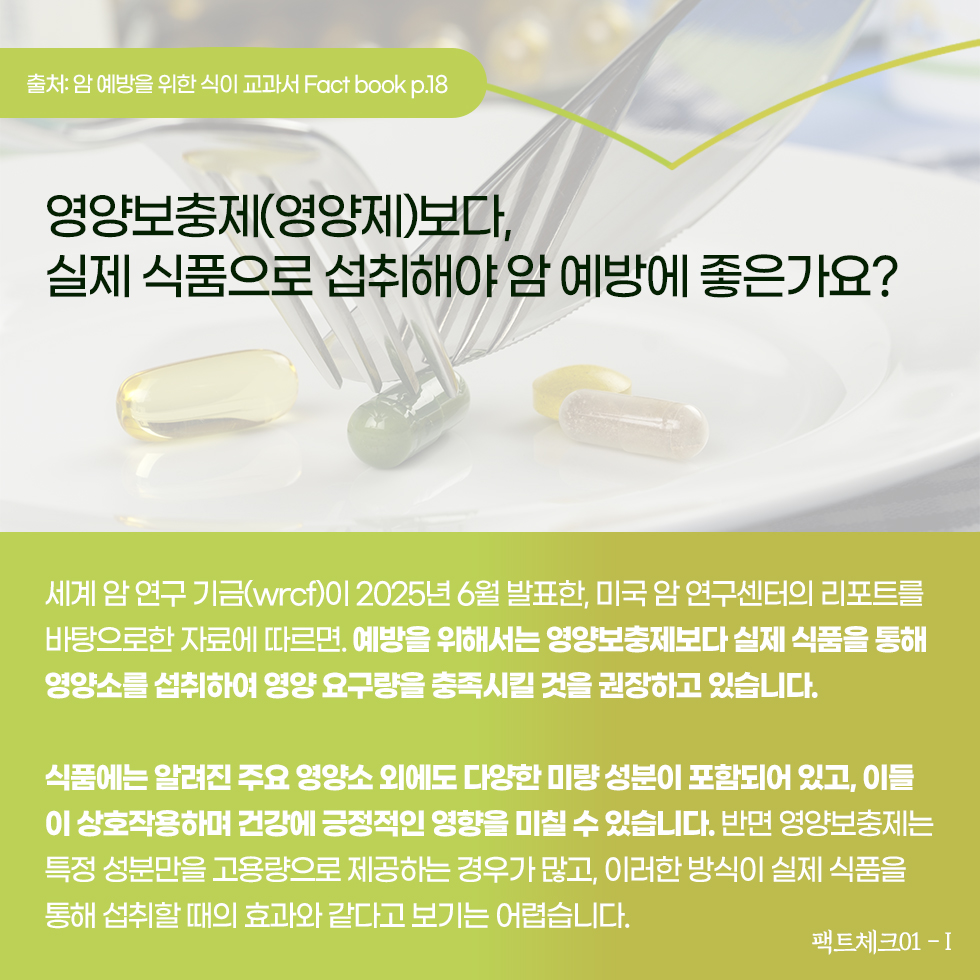 세계 암 연구 기금(wrcf)이 2025년 6월 발표한, 미국 암 연구센터의 리포트를 바탕으로한 자료에 따르면, 예방을 위해서는 영양보충제보다 실제 식품을 통해 영양소를 섭취하여 영양 요구량을 충족시킬 것을 권장하고 있습니다. 식품에는 알려진 주요 영양소 외에도 다양한 미량 성분이 포함되어 있고, 이들 이 상호작용하며 건강에 긍정적인 영향을 미칠 수 있습니다. 반면 영양보충제는 특정 성분만을 고용량으로 제공하는 경우가 많고, 이러한 방식이 실제 식품을 통해 섭취할 때의 효과와 같다고 보기는 어렵습니다.