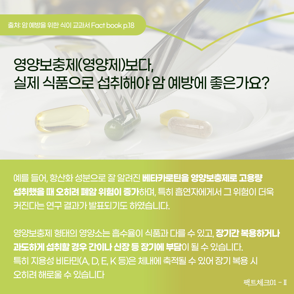 Q. 영양보충제(영양제)보다, 실제 식품으로 섭취해야 암 예방에 좋은가요?