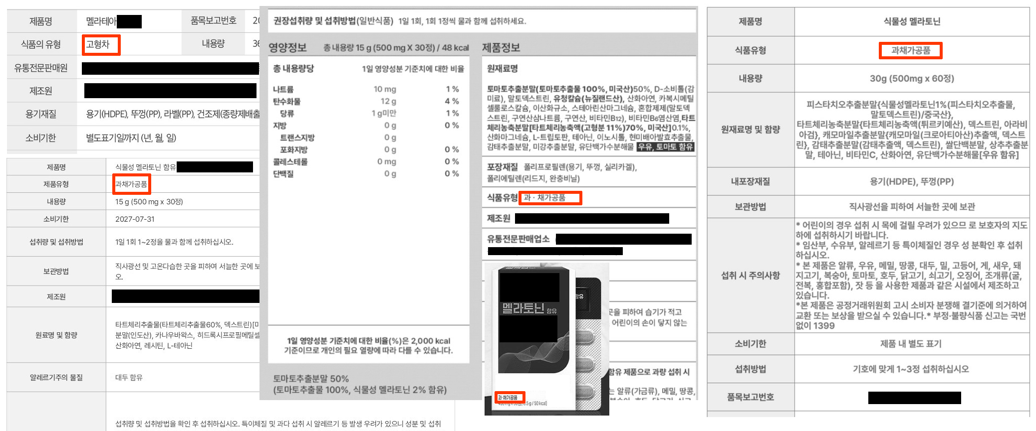 온라인에서 구매할 수 있는 멜라토닌은 "식품" - 과채가공품 혹은 고형차