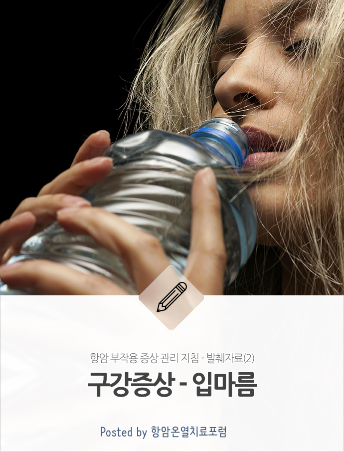 항암 환자의 약 60%, 두경부암으로 수술이나 방사선치료를 받은 환자의 약90%정도가 입마름 증상을 경험한다고 설명하고 있습니다. 보다 다양한 원인과 입마름 증상을 평가할 수 있는 항목, 경중을 판가름 할 수 있는 그리고 증상관리 방법에 대해 자세히 안내하고 있습니다. 굉장히 좋은 내용으로 암 환자 혹은 암 환자의 보호자께서는 아래의 URL을 방문하시어 e-book을 다운로드해 보시거나 열람해 보실 것을 추천드립니다.